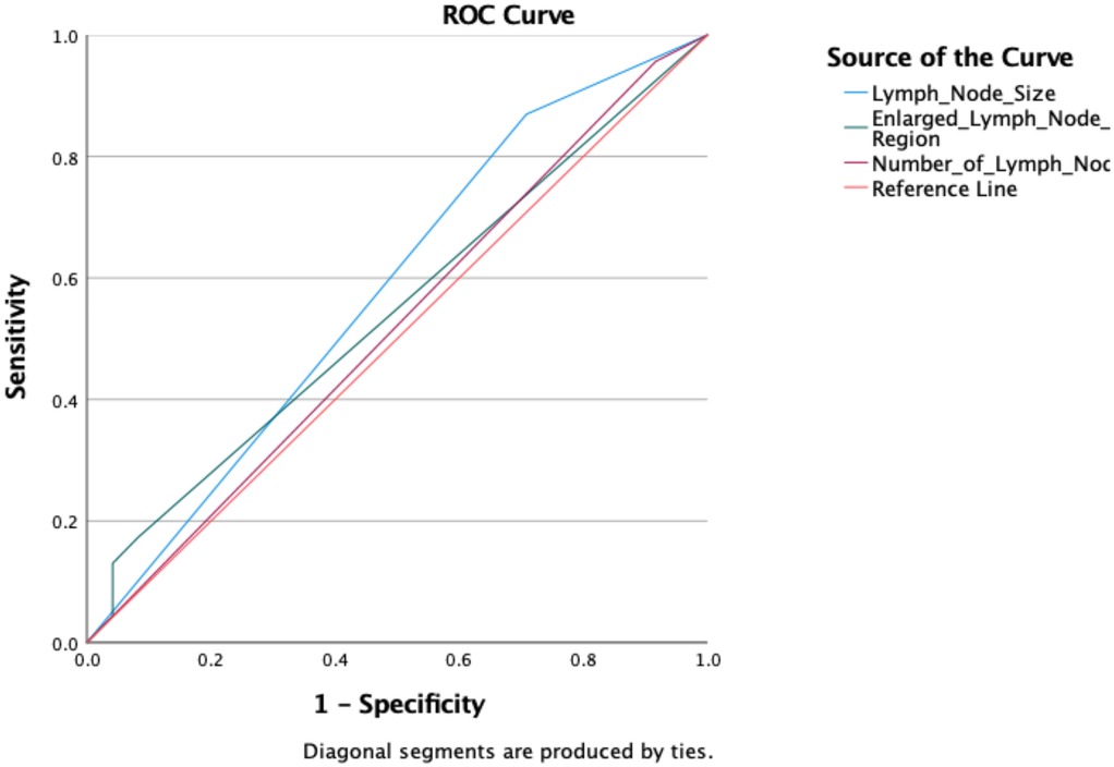 Figure 4. Receiver operating characteristic (ROC) curves for lymph node size, enlarged lymph node region, and lymph node count, showing limited discrimination for malignancy (AUC = 0.581, 0.545, and 0.520, respectively).