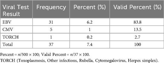 Viral test results were positive in 37 patients (7.4%), of which Epstein–Barr virus (EBV) accounted for 83.8%, cytomegalovirus (CMV) for 13.5%, and TORCH infection for 2.7% (Table 1).