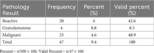 Lymph node biopsy was performed in 47 patients (9.4%). Pathology revealed reactive lymphadenopathy in 20 (42.6%), granulomatous in 4 (8.5%), and malignant in 23 (48.9%) (Table 2).