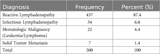 In this large retrospective cohort of 500 children with lymphadenopathy, the cervical region was the most frequently affected site, and reactive lymphadenopathy was the most common diagnosis (9). The overall malignancy rate was 5.8%, which is consistent with previously reported rates of 4%–6% in pediatric cohorts undergoing further evaluation (10, 11). These findings confirm that while lymphadenopathy in children is usually benign, a significant minority of cases are malignant and warrant careful diagnostic assessment.
