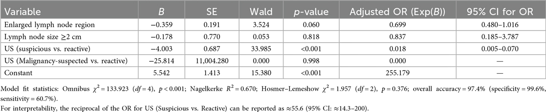 In the multivariable logistic regression analysis, ultrasonographic findings emerged as the only independent predictor of malignancy. Nodes classified as suspicious on ultrasound were associated with approximately 56-fold higher odds of malignancy (adjusted OR ≈ 55.6; 95% CI: 14.3–200; p < 0.001), whereas lymph node size and anatomical region did not retain statistical significance (p > 0.05). The model was statistically significant (Omnibus χ2 = 133.9, df = 4, p < 0.001), explained ∼67% of the variance in malignancy (Nagelkerke R2 = 0.670), and showed good calibration (Hosmer–Lemeshow χ2 = 1.96, df = 2, p = 0.376). The overall classification accuracy was 97.4%, with very high specificity (99.6%) but limited sensitivity (60.7%) (Table 4).
