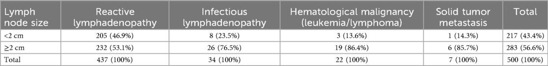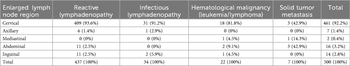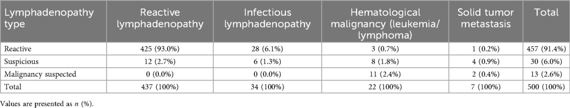 Final diagnoses in the entire cohort were: reactive lymphadenopathy in 437 (87.4%), infectious lymphadenopathy in 34 (6.8%), hematologic malignancy in 22 (4.4%), and metastatic solid tumors in 7 (1.4%) (Table 3).