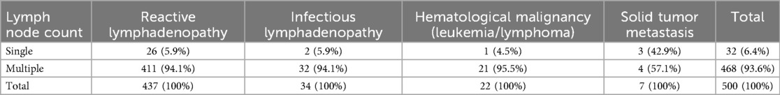 There was a significant difference between single and multiple node involvement (p = 0.001). Multiple nodes predominated among hematologic malignancies (95.5%, 21/22) and infectious lymphadenopathy (94.1%, 32/34), whereas solitary nodes were relatively more frequent in solid tumor metastasis (42.9%, 3/7) (Table 7).