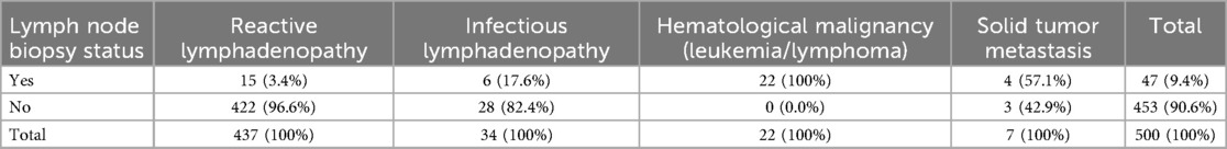 Final diagnoses differed by biopsy status (p < 0.001). Biopsy was performed in 47 patients (9.4%). Reactive lymphadenopathy was predominantly diagnosed without biopsy (96.6%, 422/437), as was infectious lymphadenopathy (82.4%, 28/34). All hematologic malignancies underwent biopsy (100%, 22/22). Among solid tumor metastases, 57.1% (4/7) had biopsy (Table 8).
