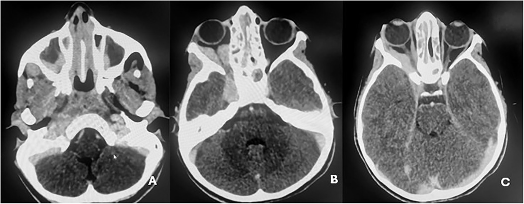 Figure 1. Contrast-enhanced cerebro-orbital scans demonstrating tissue expansion affecting both nasal cavities, extending into the maxillary sinuses (A), and the right extraconal orbital space, extending to the ipsilateral cavernous sinus (B,C).