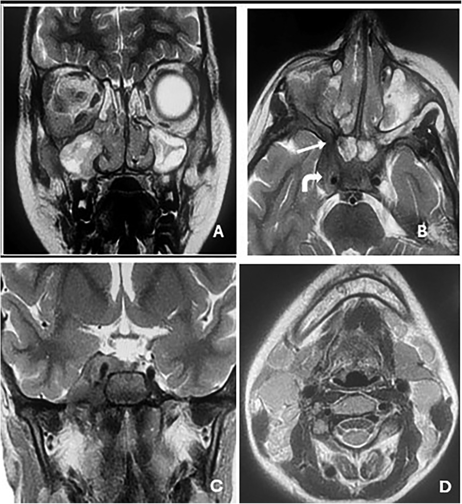 Figure 2. Orbital and cerebro-cervical MRI in T2-weighted sequences in the coronal (A and C) and axial (B) planes showing an expansive tissue signal process invading the right orbital extraconal space and nasal cavities (A); the right cavernous sinus (solid arrow in B); and the pterygopalatine fossa, infratemporal fossa, and the foramina of the skull base, with (B) showing the right round and (C) the right oval. Scan showing non-necrotic bilateral jugulocarotid and spinal lymphadenopathy (D).