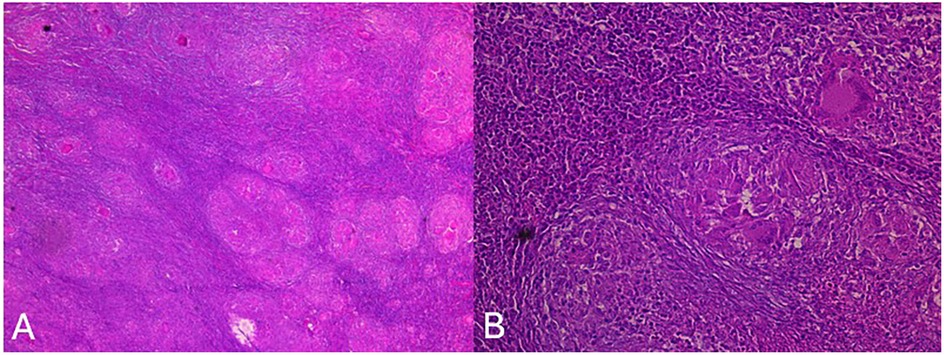 Figure 3. Anatomopathological study showing (HEx4) lymph node parenchyma altered by a specific inflammatory reaction with multiple tuberculous granulomas (A) and (HEx20) an epithelioid granuloma with focal central caseous necrosis and Langhans-type giant cells (B).