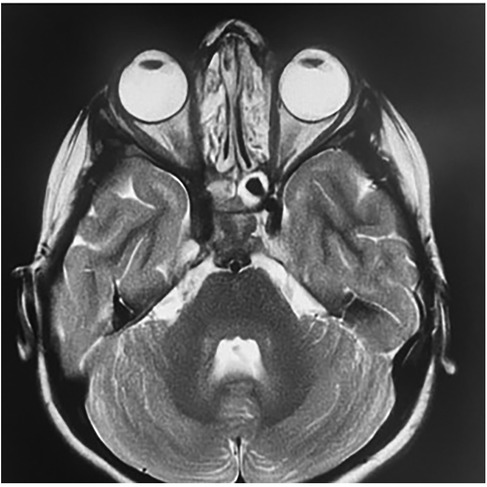 The patient is currently receiving intravenous immunoglobulin replacement therapy every 21 days while awaiting allogeneic hematopoietic stem cell transplantation (HSCT). After 6 months of anti-tuberculosis therapy, comprising 3 months of quadruple therapy (isoniazid, rifampicin, pyrazinamide, and ethambutol) followed by 3 months of dual therapy (isoniazid and rifampicin), clinical follow-up demonstrated complete resolution of her exophthalmos. Subsequent MRI confirmed marked regression of the lesions (Figure 4). At the time of reporting, she was in her ninth month of treatment, exhibiting no evidence of drug resistance and showing progressive weight gain.