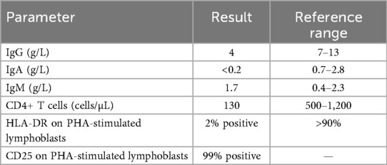 The quantitative analysis demonstrated profound CD4+ T-cell lymphopenia with IgA and IgG hypogammaglobulinemia, while her IgM levels remained within the normal range. Flow cytometry revealed a markedly reduced CD4/CD8 ratio (<0.3).