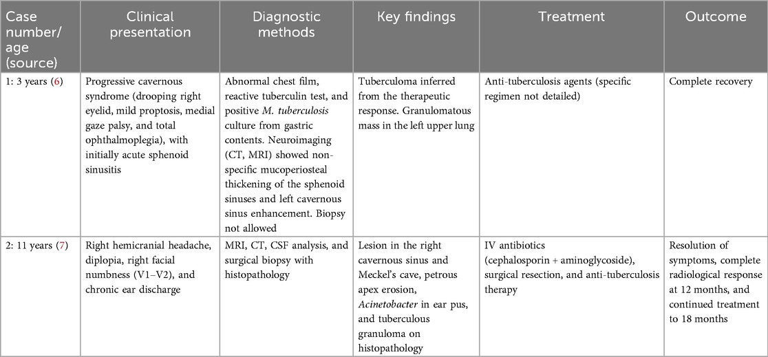 To date, only two pediatric cases of cavernous sinus tuberculoma have been documented. The first, reported in 2007, involved a 3-year-old Thai patient who presented with progressive cavernous syndrome, including right eyelid ptosis, mild proptosis, medial gaze palsy, and eventual total ophthalmoplegia. The initial clinical diagnosis was acute sphenoid sinusitis. The tuberculoma diagnosis was inferred from a reactive tuberculin test, an abnormal chest radiograph showing bilateral reticular infiltration and a calcified nodule, and a positive M. tuberculosis culture from gastric contents. No direct biopsy of the cavernous sinus was performed. The patient achieved complete recovery following anti-tuberculosis therapy (6) (Table 2).