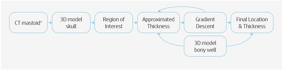 Imaging data analysis was realized using computed tomography (CT) scans of 96 pediatric patients. These scans included the temporal bone bilaterally. Each ear was seen as an individual case. The indications for the scans were not considered. The pseudonymized CT scans were identified via the appropriate radiologic code, made available for research. The information of the temporal bone thickness was analyzed as follows. Scans were imported into the software program Mimics (version 24.0, Materialise NV, Leuven, Belgium) for segmentation of the scan. A 3D model of the skull was exported in Materialise 3-matic (version 16.0, Materialise. Leuven, Belgium). To determine if it was feasible to drill out a bony well, an in-house developed script was used to automate the analysis. The automation was done using Python scripting and the Materialise Python API. The analysis was performed based on the following steps (Figure 1). Firstly, not each location on the temporal bone is suitable for placement of the R/S device. Therefore a region on each skull was determined in which the feasibility analysis took place, defined as the region of interest (ROI). The boundaries of this region were the following: the Frankfurter Horizontal plane, a perpendicular plane originating from the external auditory canal (EAC), a minimum radius of 20 mm from the EAC and a maximum radius of 30 mm from the EAC (Figure 2). Secondly, a systematic search must be performed within the ROI to identify the location in which the cortical thickness would be sufficient to implant the CI. This was realized using a gradient descent algorithm that approximates the gradient of the skull thickness determined by the size and location of the bony well. Thirdly, a 3D model of the bony well was used to subtract digitally from the ROI. This 3D model was ramped shaped, based on the dimensions of the Cochlear CI512 model. A thickness of 5.0 mm at the anterior edge of the bony well was used. Feasibility of drilling a bony well was determined based on the remaining skull thickness after digital removal of the bony well. The remaining skull had to be intact. Skull thickness descriptive data were calculated for the specific area where the bony well was digitally made, before and after the removal of the bone.