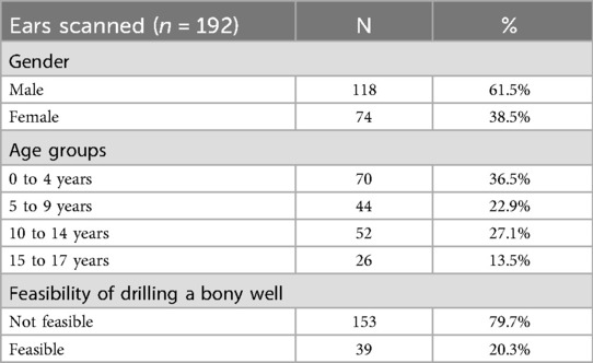Most ears analyzed were from male patients (n = 118, 61.5%). The largest age group was zero to four years of age (n = 70, 36.5%)(Table 1). In the majority of the analyzed ears, it was not feasible to drill a bony well (n = 153, 79.7%), meaning that the remaining skull after digital removal of the bony well was not intact in these cases (see methods section). This was especially frequent in the zero to four age group (n = 69, 98.6%). We found that the minimum bone thickness in all cases in this age group was below 3 mm (Figure 3). As expected, the number of cases in which it was feasible to drill a bony well increased per age group (Table 2).