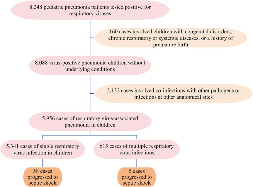 The role of identified respiratory viruses in pediatric septic shock cases remains controversial. Viral sepsis, defined as a systemic inflammatory response syndrome induced by viral infections and characterized by immune dysregulation and multiorgan dysfunction, has emerged as a critical yet understudied entity in pediatric medicine (6). Although the current pediatric sepsis guidelines predominantly emphasize bacterial etiologies, emerging evidence underscores the capacity of respiratory viruses to independently trigger sepsis and septic shock. This is evidenced by research on severe acute respiratory syndrome coronavirus 2 (SARS-CoV-2), revealing that a considerable proportion of critically ill pediatric patients with coronavirus disease 2019 (COVID-19) develop shock-like symptoms without any bacterial coinfections (7–9). Similarly, influenza-associated neuroinvasive complications have been linked to severe systemic inflammation and multiorgan failure, further highlighting this viral pathogenesis (10). However, the true prevalence of viral -associated septic shock is likely obscured by methodological limitations in both guidelines and epidemiological studies, including the systematic exclusion of viral cases (selection bias) and inadequate classification of pathogens. Consequently, a considerable gap persists in the existing guidelines, as they lack comprehensive recommendations for diagnosing and managing viral -associated septic shock in children.
