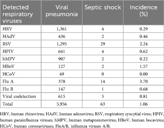 3.2 The incidence of septic shock differs significantly among children with pneumonia, stratified by causative viral respiratory infections (p < 0.001). As shown in Table 1, FluA showed the highest incidence rate at 3.70% (14/378), followed by HBoV at 1.57% (2/127) and RSV at 2.24% (29/1,295). The patients with HCoV infections did not develop septic shock. Viral codetection was present in 0.81% of cases (5/615), with an overall incidence of septic shock of 1.06% (63/5,956) across all viral pneumonia cases.