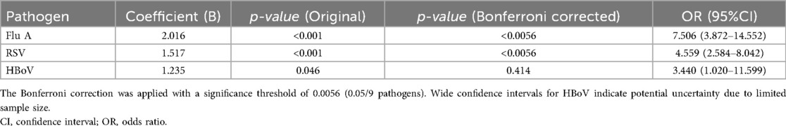 3.3 Logistic regression analysis identified three respiratory viruses associated with the development of septic shock. After Bonferroni correction for multiple comparisons (threshold p < 0.0056), only FluA and RSV remained significant independent predictors. FluA showed the strongest association [odds ratio [OR] = 7.506, 95% confidence interval [CI]: 3.872–14.552, p < 0.001], followed by RSV (OR = 4.559, 95% CI: 2.584–8.042, p < 0.001). HBoV demonstrated a nominal association that was not significant after correction (OR = 3.440, 95% CI: 1.020–11.599, p = 0.046). The complete data are presented in Table 2.