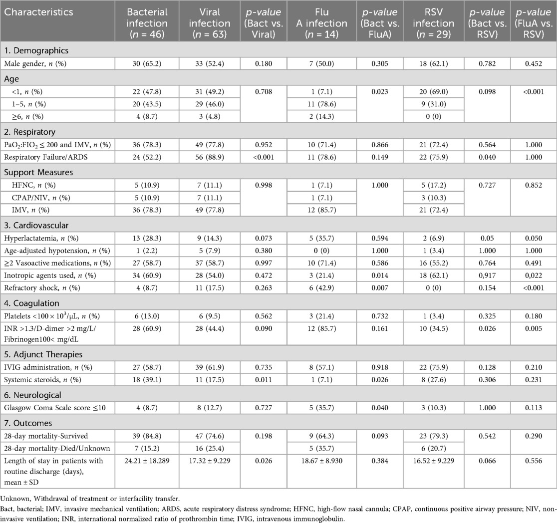 3.5 Table 3 presents a comprehensive comparative analysis of the clinical characteristics and outcomes among pediatric septic shock patients stratified by pathogen type (bacterial, viral, FluA, and RSV). The analysis of clinical characteristics revealed several significant differences between the etiological groups. The age distribution varied significantly, with the FluA group showing a markedly lower proportion of infants aged <1 year than the bacterial group (7.1% vs. 47.8%, p = 0.023). Conversely, the RSV group had a significantly higher proportion of infants aged <1 year than the FluA group (69.0% vs. 7.1%, p < 0.001).