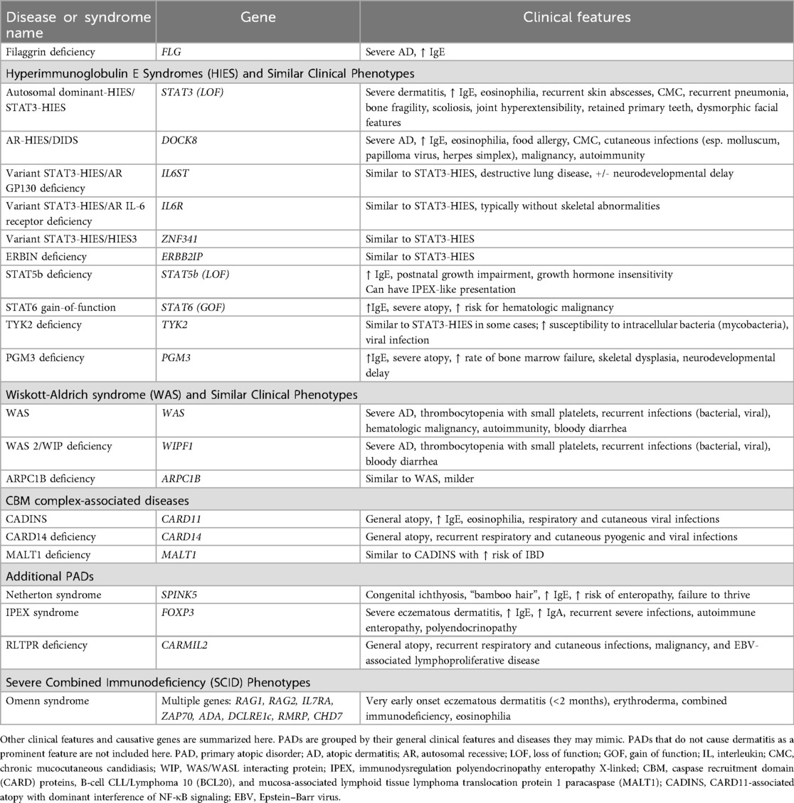 LOF variants of the gene FLG, which encodes filament aggregating protein (filaggrin), cause the most common PAD (50, 51). FLG LOF mutations with variable degrees of function follow a semi-dominant inheritance pattern, with homozygous or compound heterozygous genotypes conferring increased risk of AD and an early presentation of AD (within the first months of infancy) (52, 53). While FLG LOF is not specifically associated with immune deficiency, skin barrier breakdown in these patients can lead to increased cutaneous infections and immune dysregulation. The AD affecting these patients may also be treatment-resistant. Although filaggrin deficiency is the most common PAD, the availability of diagnostic genetic testing is limited due to challenges of sequencing this gene (54).