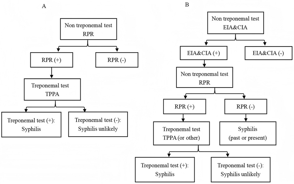 Currently, the laboratory diagnosis of syphilis primarily relies on serological tests, which can be categorized into treponemal antibody tests and non-treponemal antibody tests (5). The treponemal antibody tests, such as enzyme-linked immunosorbent assay (EIA) and chemiluminescence immunoassay (CIA), remain widely utilized in laboratory settings due to their exceptional sensitivity and specificity for detecting treponemal antibodies. These tests are extensively employed as the primary screening method for blood donors (6). Traditionally, serological testing for syphilis begins with the use of non treponemal tests such as the toluidine red unheated serum test (TRUST) and rapid plasma reagin (RPR) (7). The specific treponemal test, such as treponema pallidum particle agglutination (TPPA), was then used for confirmation, as shown in Figure 1A. Recently, to enhance the accuracy of syphilis screening results, a “reverse algorithm” has been proposed. This approach incorporates an initial specific treponemal antibody test, such as EIA or CIA, prior to the conventional screening strategy (8). The detailed procedure is illustrated in Figure 1B.