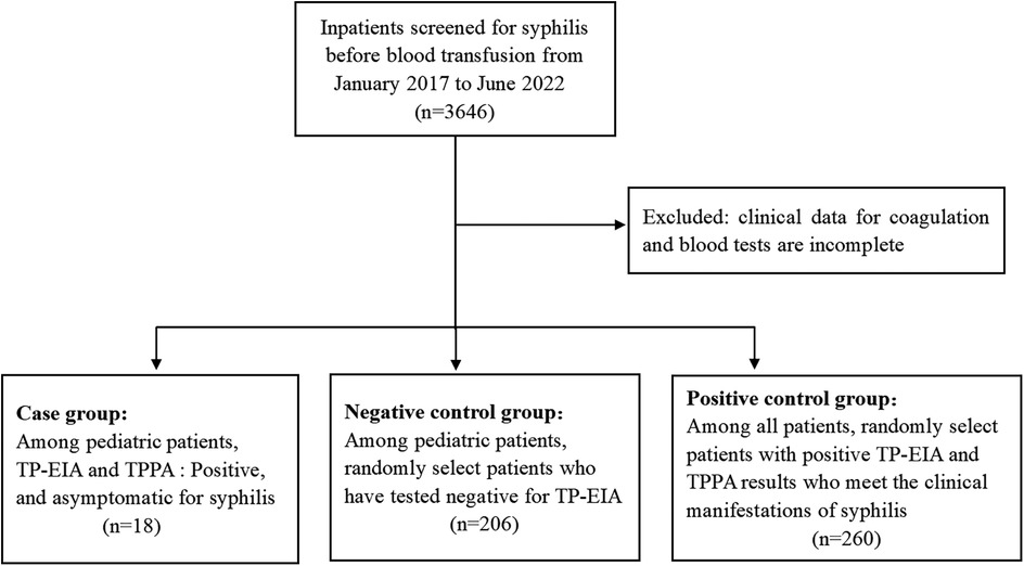 Children who exhibited false-positive syphilis serological test results were identified through the reverse algorithm of syphilis testing among those planned to receive blood transfusions, surgery, or other treatments at Jinling Hospital between January 2017 and June 2022. The physical examination findings were within normal limits in all cases, including normal skin color, absence of jaundice, and normal skin temperature and moisture levels. None of the patients reported a history of hepatitis, tuberculosis, malaria, asthma, surgery, trauma or blood transfusion. Additionally, there was no clear evidence of drug allergies. The control group in this study comprised 206 individuals who tested negative for syphilis serologically and were randomly selected from the children during the same time period. The demographic data, clinical data, and coagulation function results of the above two groups were collected, including prothrombin time (PT), activated partial thromboplastin time (APTT), plasma thrombin time (TT), fibrinogen (FIB), fibrin degradation product (FDP), D-dimer (DD), antithrombin III (AT-III) and platelet (PLT). Additionally, 260 adult patients who were clinically diagnosed with syphilis during the same period were randomly selected. Their TP-EIA results and clinical examination data were collected for inclusion in the positive control group. Figure 2 presents the flowchart of the study cohort. All strategies conducted in this study involving human participants were in accordance with the ethical standards of the institutional and/or national research committee and with the 1964 Helsinki declaration and its later modifcations or comparable ethical standards. This study was approved by the Ethics Committee of Jinling Hospital.