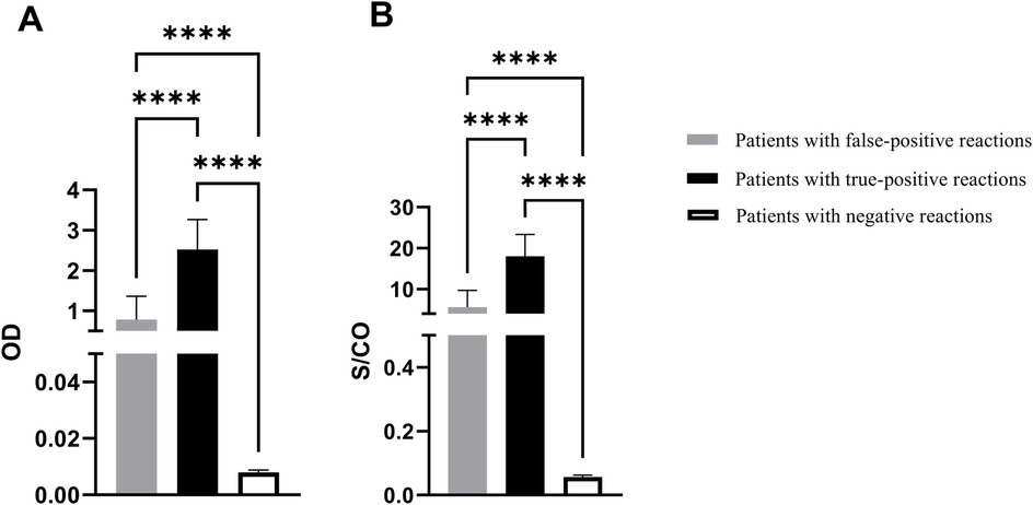 Figure 3. The EIA results for syphilis antibodies. (A) OD value of syphilis antibody test. (B) S/CO ratio. OD: optical density; S/CO: signal-to-cutoff; ****p < 0.0001.