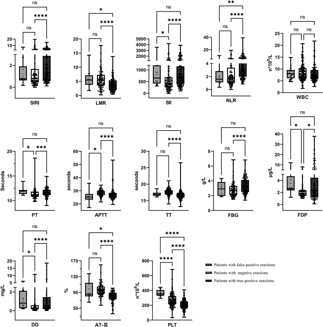 The systemic inflammatory indicators and coagulation function changes were retrospectively analyzed in 18 cases with false serological positivity, 206 cases with negative syphilis test results, and 260 cases with true-positive syphilis. Children with false-positive syphilis test results exhibited significantly higher levels of SII, FDP, and PLT counts compared to those with negative test results (p < 0.05). When compared to children with true-positive syphilis test results, those with false-positive results demonstrated lower levels of SIRI and NLR, but markedly elevated levels of LMR, AT-III, and PLT counts (p < 0.05), as shown in Figure 4.