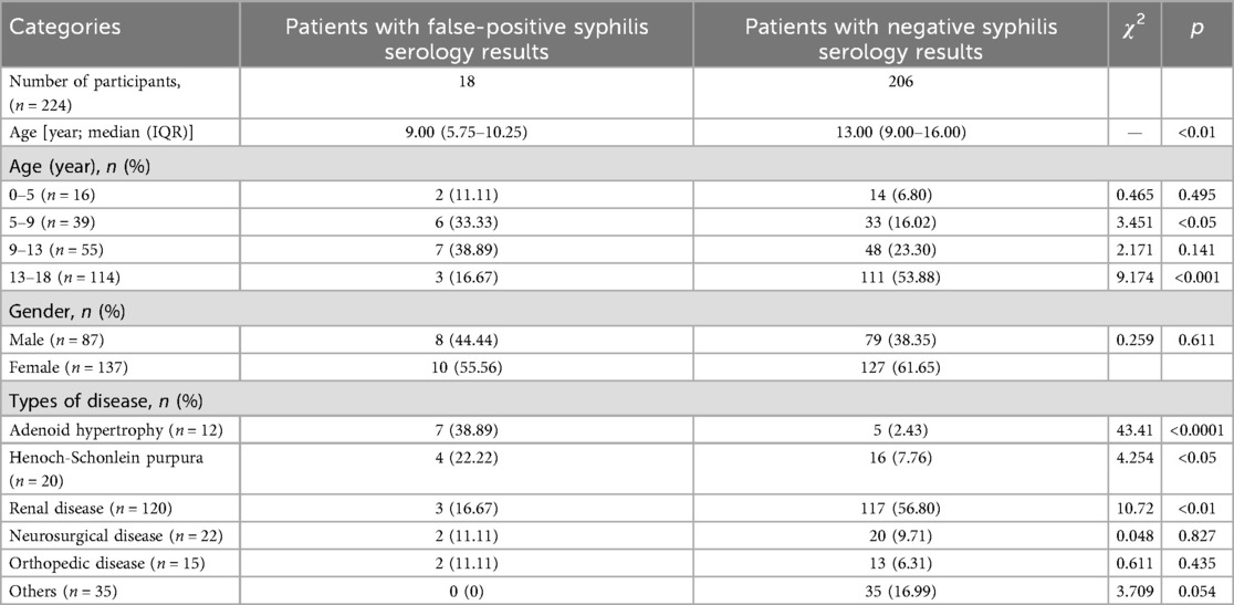 A total of 224 cases were included in this investigation, among which 18 exhibited false-positive syphilis antibody test results, with a median age of 9.00 (5.75–10.25) years old. The diagnoses comprised 4 cases of Henoch-Schonlein purpura (HSP), 7 cases of adenoid hypertrophy (AH), 3 cases of renal disease, 2 cases of orthopedic disease, and 2 cases of neurosurgical disease. Among the remaining 206 children who tested negative for syphilis antibodies, their median age was 13.00 (9.00–16.00) years old. As a result, the mean age of children exhibiting false-positive syphilis test results was significantly lower compared to that of patients with negative test results (p < 0.001). The false positive group consisted of 8 males (44.44%) and 10 females (55.56%), while the negative group comprised of 79 males (38.35%) and 127 females (61.56%). This study examined differences in age distribution between children with false positive results and those with negative results. The findings indicated that in the 5–9 years old and 9–13 years old groups, the proportions of false positive cases were 33.33% and 38.89%, respectively, which were significantly higher than the corresponding proportions of 16.02% and 23.30% observed in the negative group. The difference in the 5–9 years old group was statistically significant (p < 0.05). In contrast, within the 13–18 years old group, the proportion of false positive cases was 16.67%, substantially lower than the 53.88% reported for the negative group (p < 0.001). Furthermore, in terms of comparisons among different age groups, the number of false positive cases among children aged 5–9, 9–13, and 13–18 years old was 6 (15.38%), 7 (12.72%), and 3 (2.63%) respectively, which also indicates that the age group of 5–13 years old has a higher false positive rate. Among children with false-positive syphilis test results, the proportions of AH and HSP are 38.89% and 22.22% respectively, which are significantly higher than those among children with negative syphilis test results (p < 0.05), as shown in Table 1.