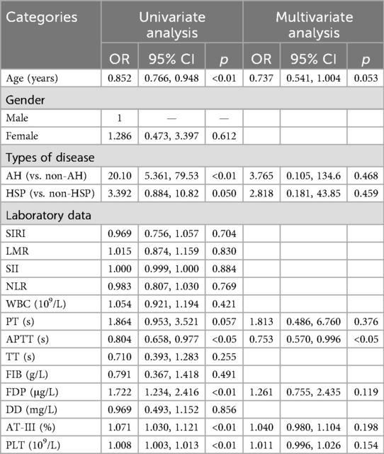 A syphilis serological false-positive result was designated as the dependent variable, while age, gender, AH, HSP, systemic inflammatory markers, and coagulation function parameters were selected as independent variables. Univariate and multivariate logistic regression analysis were used to conduct correlation analysis. Univariate logistic regression analysis revealed that age (OR = 0.852, 95% CI: 0.766, 0.948), AH (OR = 20.10, 95% CI: 5.361, 79.53), APTT (OR = 0.804, 95% CI: 0.658, 0.977), FDP (OR = 1.722, 95% CI: 1.234, 2.416), AT-III (OR = 1.071, 95%CI: 1.030, 1.121), and PLT (OR = 1.008, 95%CI: 1.003, 1.013) were risk factors associated with the occurrence of a false positive reaction in syphilis serology (p < 0.05). Age, AH, HSP, PT, APTT, FDP, AT-III, and PLT were included in the multivariate regression analysis. The results indicated that APTT (OR = 0.753, 95% CI: 0.570, 0.996) was a significant independent predictor (p < 0.05). There were no statistically significant differences observed in the remaining indicators (p > 0.05), as shown in Table 2.