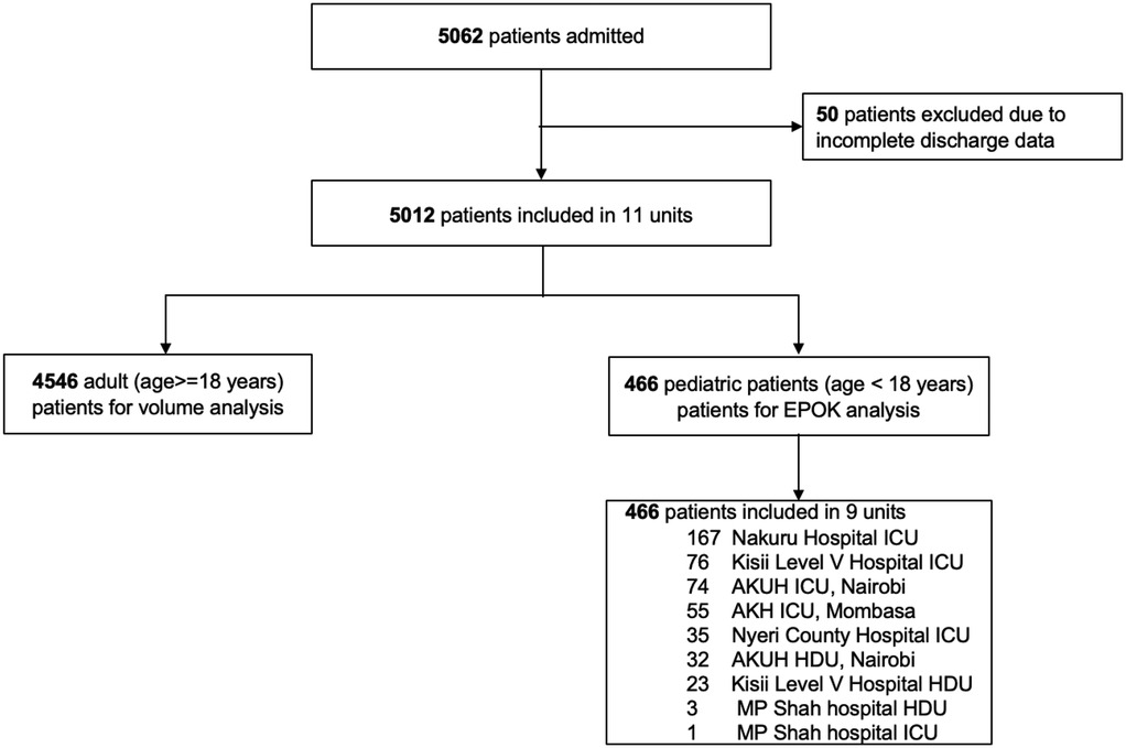 Flowchart depicting patient selection for analysis. Initially, 5062 patients were admitted. Of these, 50 were excluded due to incomplete discharge data, leaving 5012 patients included across 11 units. Among them, 4546 adults (aged eighteen or older) were selected for volume analysis, and 466 pediatric patients (under eighteen) were chosen for EPOK analysis. The pediatric patients were spread across nine units: 167 in Nakuru Hospital ICU, 76 in Kisii Level V Hospital ICU, 74 in AKUH ICU Nairobi, 55 in AKH ICU Mombasa, 35 in Nyeri County Hospital ICU, 32 in AKUH HDU Nairobi, 23 in Kisii Level V Hospital HDU, 3 in MP Shah Hospital HDU, and 1 in MP Shah Hospital ICU.