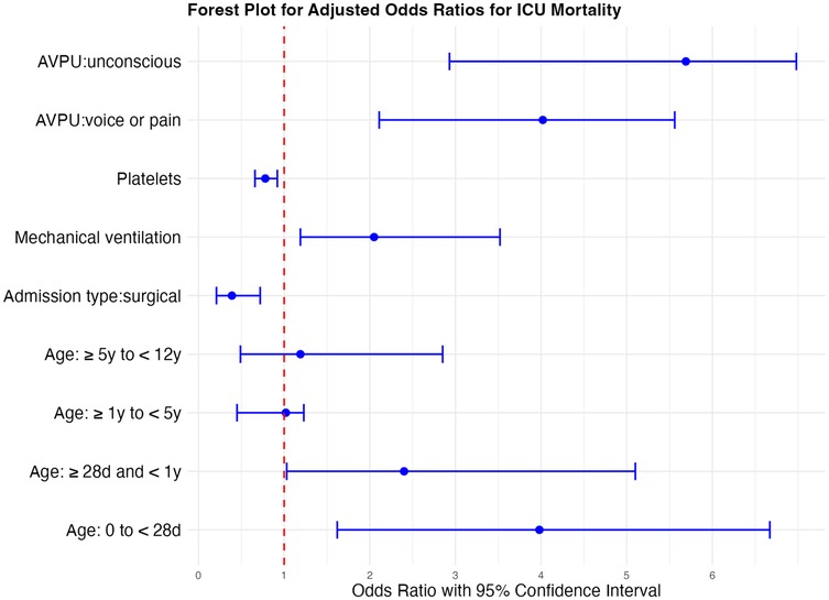Forest plot showing adjusted odds ratios for ICU mortality with 95% confidence intervals. Variables include AVPU status, platelets, mechanical ventilation, surgical admission type, and age groups. Each blue line represents a variable’s odds ratio and confidence interval, with a red dashed line at 1 indicating no effect.
