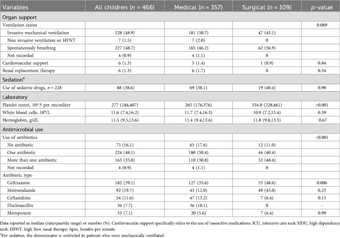 Half of the children received invasive ventilation while non-invasive ventilation was rarely used (Table 2). A minority of patients received vasoactive drugs and renal replacement therapy was uncommon. Approximately one in five children were sedated during the first 24 h of admission. More than 80% of children received at least one antibiotic, with a higher antibiotic prescription rate in the surgical group. Ceftriaxone was the most frequently prescribed drug in both groups, followed by metronidazole.