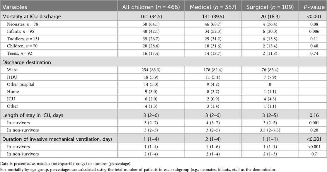 Of the 5,012 ICU or HDU admissions, 466 (9.3%) involved critically ill children (Figure 1). The proportion of critically ill children remained stable over time (Supplemenatry Figure S1). The median age was 2.0 (0.4–9.0) years, with 173 children (37.1%) aged under one year (Table 1). Most cases were medical (76.6%), and included pneumonia, head injury, organophosphate poisoning and respiratory distress of the newborn as main admission codes (Supplementary Table S4). Surgical admissions included emergency surgeries that were more prevalent as compared to planned surgeries. Explorative laparotomy and craniotomy were the most frequent surgical procedures (Supplementary Table S5). Median modified ED–PEWS was higher in medical patients compared to surgical patients (20 vs. 13; p = 0.01). A significantly higher proportion of medical patients were classified as unresponsive on the AVPU scale at admission compared to the surgical cohort (20.2% vs. 8.3%; p = <0.001).
