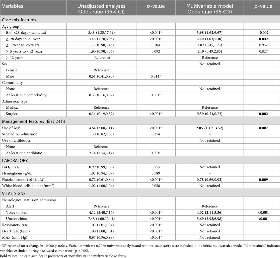 Independent risk factors for mortality included age < 28 days (aOR 3.98, 95% CI 1.62–6.67; p = 0.002), admission due to a medical reason, unresponsiveness at admission (aOR, 5.69, 95% CI 2.93–6.98; p < 0.001), and receiving invasive ventilation (aOR 2.05, 95% CI 1.19–3.52; p < 0.001), while higher platelet count was associated with increased survival (aOR 0.78, 95% CI 0.66–0.92; p = 0.009) (Table 4 and Figure 2).