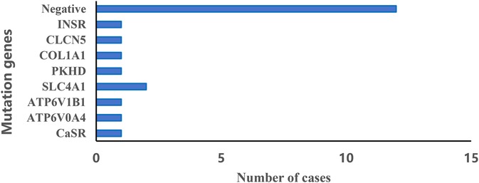 Ten cases (20%) had a family history of renal disease, including NL (70%), NC (10%), renal cysts (10%) and hypercalciuria (10%). Among these cases, the mother of one child concurrently suffered from RTA, polycystic kidney disease, and NL. Only 3 out of 10 children with positive family history underwent genetic analysis: 2 had SLC4A1 gene mutation and 1 had PKHD gene mutation.