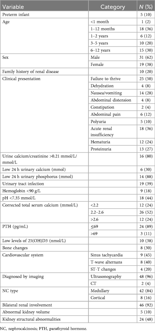 This study retrospectively collected and analyzed the medical records of children diagnosed with NC who were admitted to the Children's Hospital of Chongqing Medical University between January 1, 2016, and December 31, 2022. We enrolled patients with sonographic reports of “nephrocalcinosis”or “medullary nephrocalcinosis” by radiologists and excluded patients with solitary nephrolithiasis. Patients were excluded from the study if their key general demographic records were incomplete. A total of 50 children met the inclusion criteria and were included in the analysis.