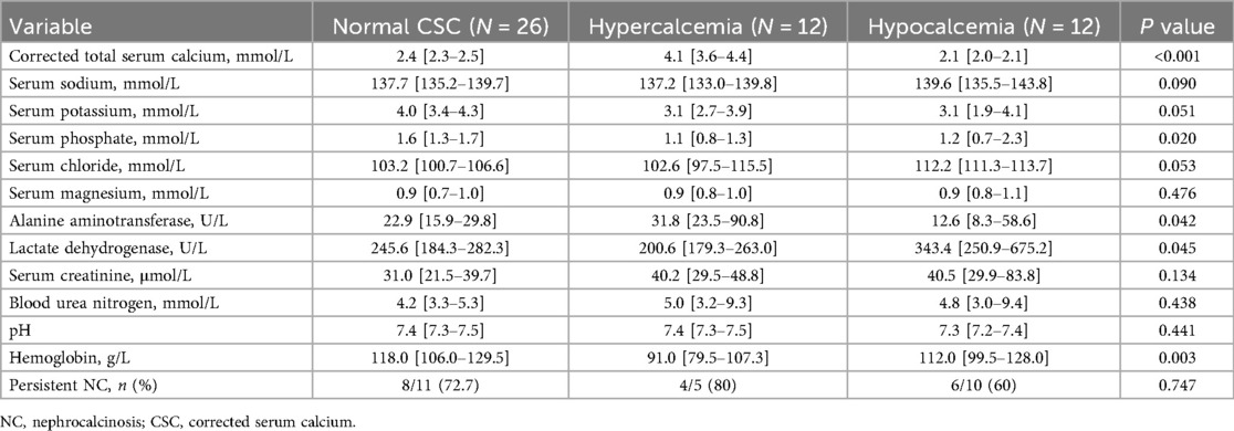 The kidneys play a vital role in maintaining calcium homeostasis by regulating the reabsorption and excretion of calcium in response to changes in blood calcium levels and hormonal signals (23). Disruptions these mechanisms can lead to disorders such as hypercalcemia or hypocalcemia, which can significantly affect various organ systems and overall health (24). In our study, children with NC were categorized into three subgroups based on their total serum calcium levels. Unfortunately, the radiological improvement rate of NC remained unsatisfactory across all groups, suggesting that calcium imbalance alone may not fully account for disease persistence. Notably, among the hypercalcemic group, 75% (9/12) presented symptoms within the first year of life and frequently exhibited with mild to moderate anemia. However, the relationship between serum calcium levels and the progression of NC remains to be further elucidated.