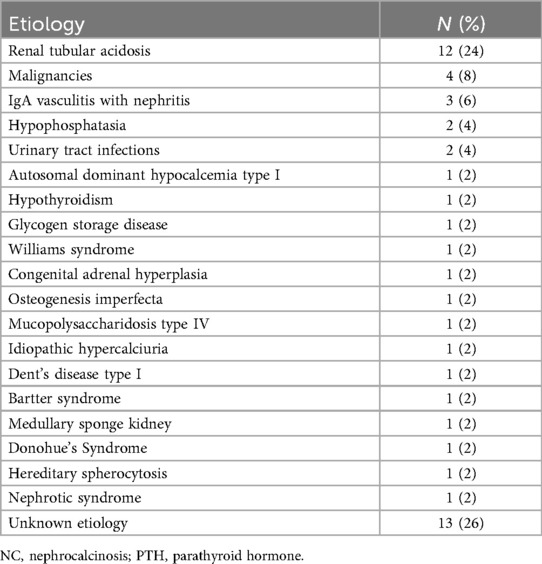 As demonstrated in Table 3, the underlying etiologies of NC varied among the patients. RTA was the most frequent cause, accounting for 24% of the cases. Other notable etiologies included malignancies (8%), IgA Vasculitis with nephritis (6%), and hypophosphatasia (4%). Additionally, 26% of the cases had unknown etiologies, with 3 patients diagnosed with genetic syndromes where the exact cause remained unidentified. However, it was interesting to note that, all the 3 cases presented with growth and development retardation as the core manifestation. Two of them were siblings, both presenting with special facial features and hypercalcium crises, and they were eventually suspected of having familial hypocalciuric hypercalcemia (FHH). The other child was accompanied by skin pigmentation and hirsutism (Table 3).