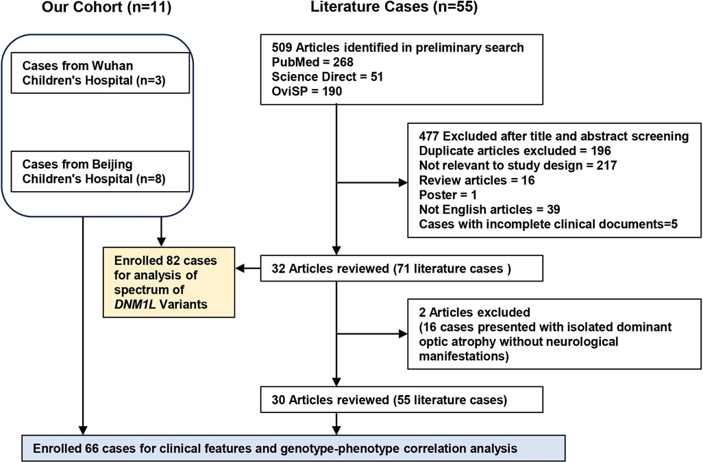 A total of 82 patients with DNM1l-associated disorders have been reported across 32 articles from 2007 to June 2025, including the cases described in this study (4–6, 13–41). Of these, 16 patients presented with isolated dominant optic atrophy without neurological manifestations (13, 14). Consequently, the following analysis focuses on the remaining 66 patients of diverse ethnic and national backgrounds.