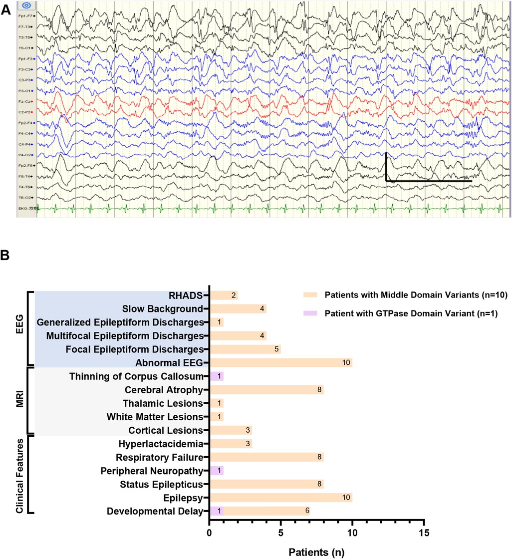 Figure 2. Clinical features in our Chinese cohort. (A) The electroencephalogram (EEG) of patient 4 in Chinese cohort showed typical RHADS in the bilateral frontal and central regions (1s,100uv,1.0 Hz,70 Hz). (B) Distribution of clinical features in our Chinese cohort of 11 patients harboring DNM1l variants in the GTPase or middle domain. RHADS: rhythmic high amplitude delta waves with superimposed (poly)spikes, EEG: electroencephalogram, MRI: magnetic resonance imaging.