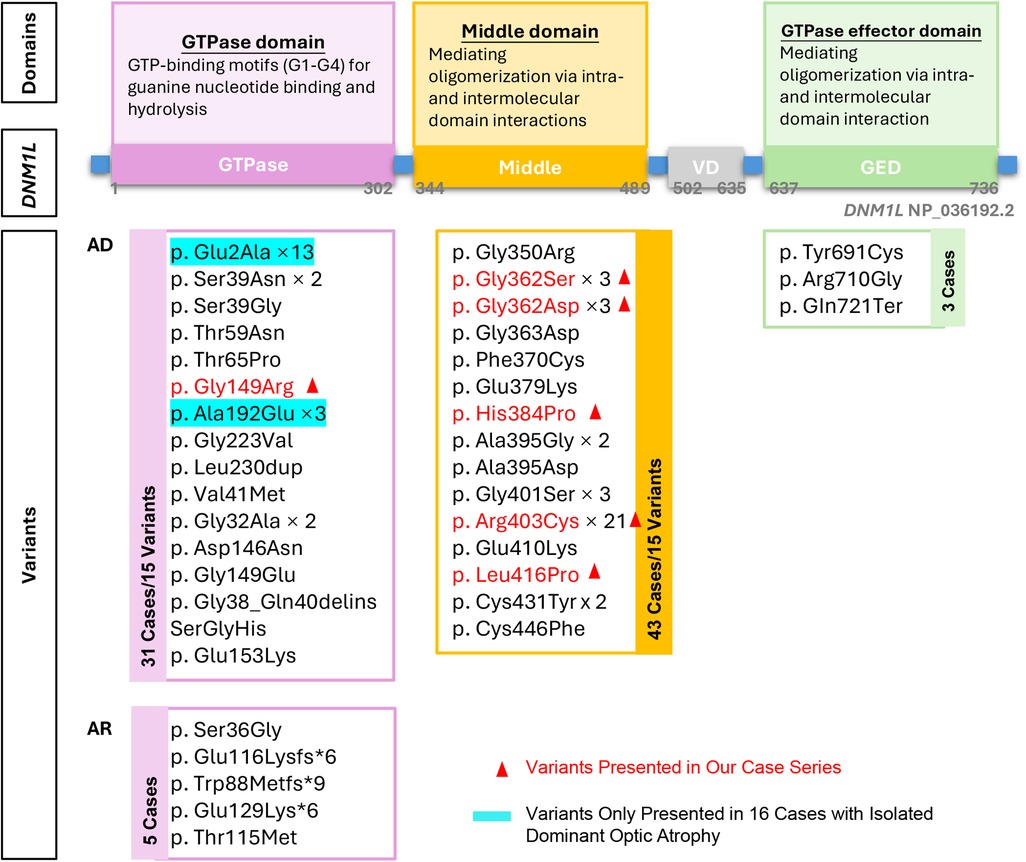 Figure 3. Overview of the domain structure of DNM1l, the identiffed variants at each domain. AD: autosomal dominant inheritance, AR: autosomal recessive inheritance.