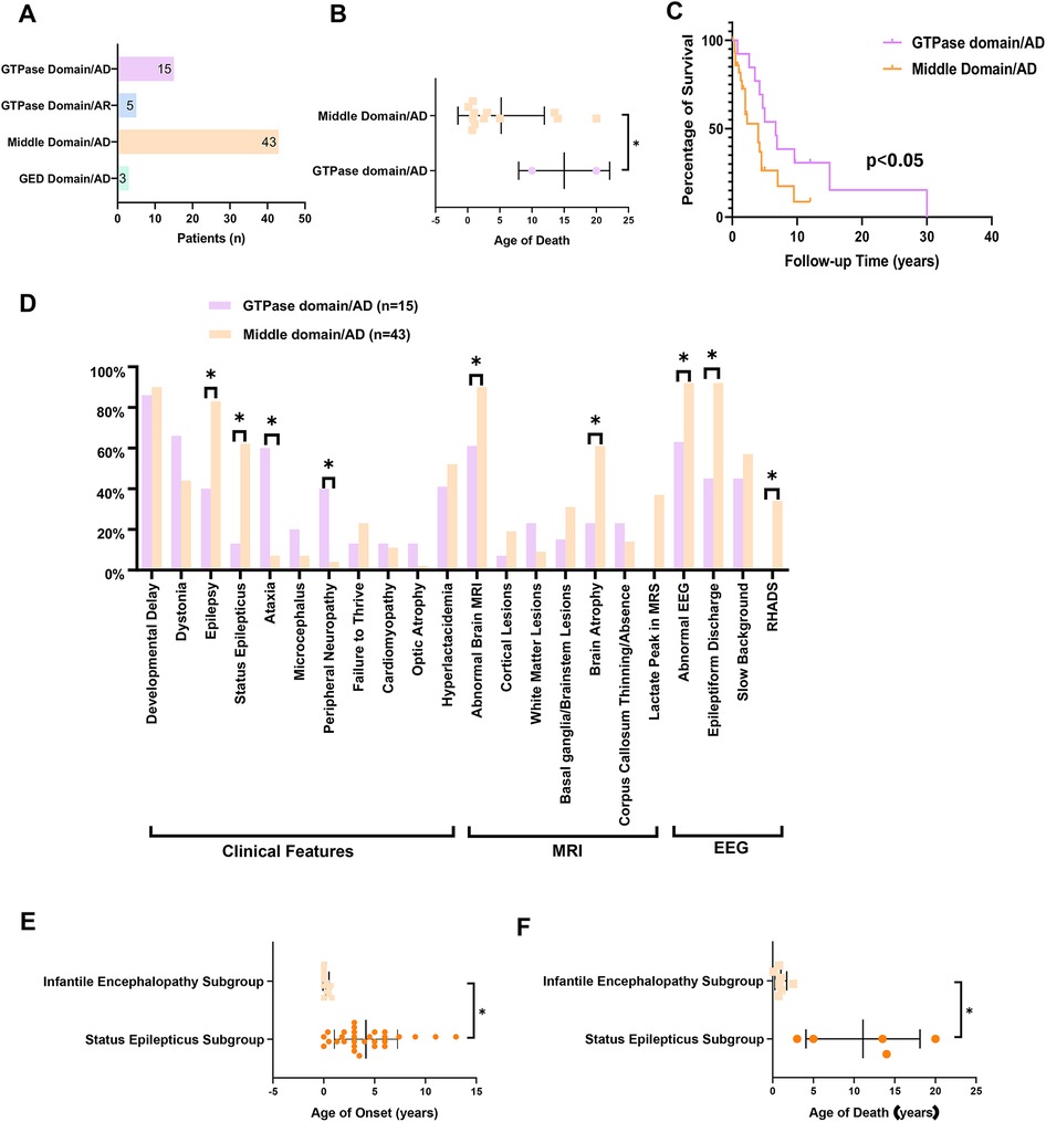 Figure 4. The clinical and genetic spectrum and genotype-phenotype correlation analysis of DNM1l-related disorders. (A) The patients’ number in GTPase domain/AD group (n = 15), middle domain/AD group (n = 43), GED domain/AD group (n = 3), and GTPase domain/AR group (n = 5). (B) The age of death in GTPase vs. middle domain/AD group patients. (C) Survival analysis between GTPase and middle domain/AD group. (D) Distribution of the clinical features of patients in GTPase domain/AD group and middle domain/AD group. (E) The age of death in status epilepticus subgroup vs. infantile encephalopathy subgroup. (F) The age of onset in status epilepticus subgroup vs. infantile encephalopathy subgroup. * P < 0.05. AD: autosomal dominant inheritance, AR: autosomal recessive inheritance, RHADS: rhythmic high amplitude delta waves with superimposed (poly)spikes, EEG: electroencephalogram, MRI: magnetic resonance imagin.