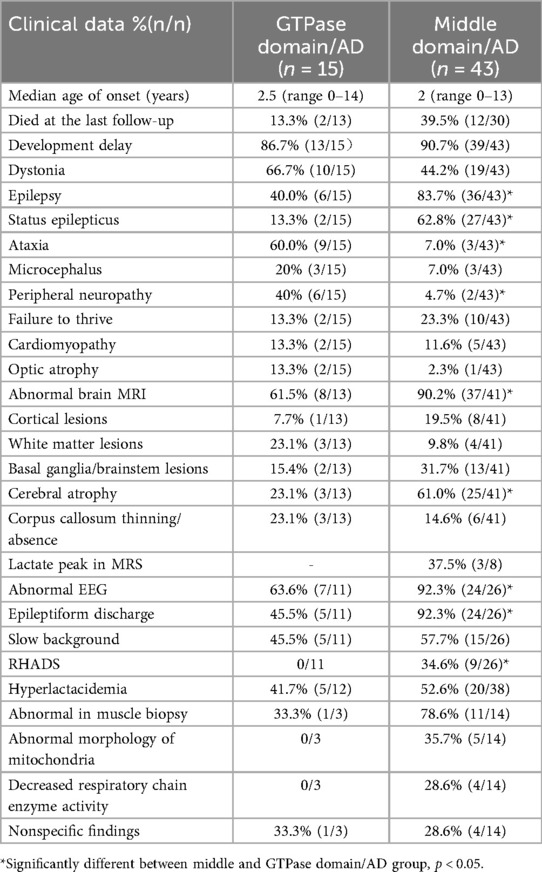 The median age of onset was 2.5 years (range, 0–14 years) in the GTPase domain/AD group and 2.0 years (range, 0–13 years) in the middle domain/AD group (p = 0.39). The middle domain/AD group exhibited significantly higher rates of epilepsy (83.7% vs. 40%), status epilepticus (67.4% vs. 13.4%), and cerebral atrophy (61.0% vs. 45.5%) compared with the GTPase domain/AD group (all p < 0.05; Table 1). Conversely, the GTPase domain/AD group showed higher frequencies of peripheral neuropathy (40% vs. 4.7%) and ataxia (60% vs. 7%) (both p < 0.05; Table 1). Other clinical features—including developmental delay, dystonia, failure to thrive, microcephaly, cardiomyopathy, and optic atrophy—occurred at comparable frequencies between the two groups. EEG analysis revealed a significantly higher burden of epileptiform discharges in the middle domain/AD group (p < 0.05). Notably, RHADS was observed exclusively in nine middle domain/AD cases with status epilepticus, five of whom carried the p.Arg403Cys variant.
