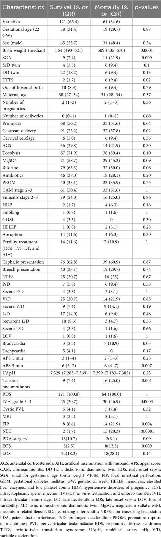 Results: Among 185 infants, 64 (34.6%) did not survive. Mortality was associated with a lower birth weight (509 g vs. 564 g, p = 0.0001) and higher rates of small for gestational age (SGA; 21.9% vs. 7.4%, p = 0.009). Independent predictors included SGA [odds ratio (OR): 5.8], tension pneumothorax (OR: 9.9), severe intraventricular hemorrhage (OR: 3.3), focal intestinal perforation (OR: 4.1), necrotizing enterocolitis (OR: 18.9), and early-onset sepsis (OR: 9.7). Cesarean delivery was associated with reduced mortality (OR: 0.3).