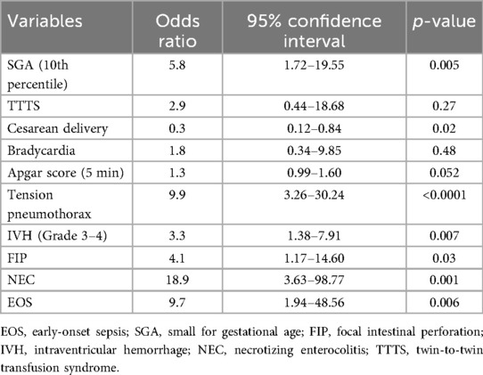 Univariate analyses identified significant differences in multiple variables, including SGA (≤10th percentile), twin-to-twin transfusion syndrome (TTTS), cesarean delivery, fetal bradycardia, 5 min Apgar score, tension pneumothorax, severe IVH (Grade ≥3), FIP, NEC, and EOS. Logistic regression analysis further identified several independent predictors of mortality. SGA (OR: 5.8, 95% CI: 1.72–19.55; p = 0.005), tension pneumothorax (OR: 9.9, 95% CI: 3.26–30.24; p < 0.0001), severe IVH (Grade ≥3) (OR: 3.3, 95% CI: 1.38–7.91; p = 0.007), FIP (OR: 4.1, 95% CI: 1.17–14.60; p = 0.03), NEC (OR: 18.9, 95% CI: 3.63–98.77; p = 0.001), and EOS (OR: 9.7, 95% CI: 1.94–48.56; p = 0.006) were all associated with an increased risk of mortality. In contrast, cesarean delivery demonstrated a protective effect against mortality (OR: 0.3, 95% CI: 0.12–0.84; p = 0.02) (Table 2; Figure 1).
