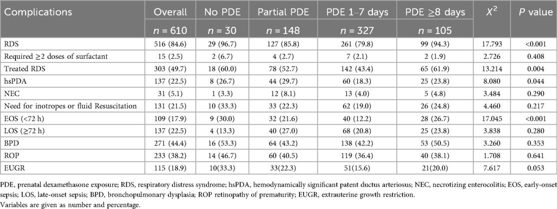 A total of 755 VLBW infants and VPIs were admitted to our neonatal unit from 2022 to 2024. After applying exclusion criteria—including receipt of more than one course of dexamethasone therapy, hospitalization duration <28 days, missing data on prenatal dexamethasone exposure, and chromosomal or genetic abnormalities—145 infants were excluded. The final analysis comprised 610 neonates. Table 1 presents the characteristics of the study participants. The median gestational age and birth weight of the study population were 29.9 [28.3, 31.0] weeks and 1,261.0 ± 312.5 g, respectively. The overall rate of PDE was 95.1% (580/610), with PDE administered 1–7 days before preterm birth in 56.4% of cases.