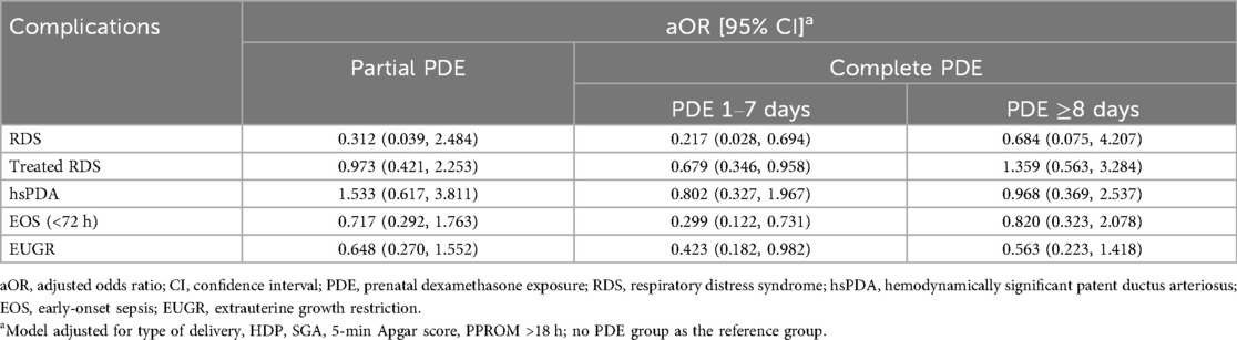 In the adjusted logistic regression model (Table 3), the PDE 1–7 days group showed a significantly decreased aOR for EOS [aOR: 0.299 (95% CI: 0.122, 0.731)] compared with the no PDE group. The PDE 1–7 days group also demonstrated significantly decreased aOR for RDS [aOR: 0.217 (95% CI: 0.028, 0.694)], treated RDS [aOR: 0.679 (95% CI: 0.346, 0.958)] and EUGR [aOR: 0.423 (0.182, 0.982)] compared with the no PDE group.