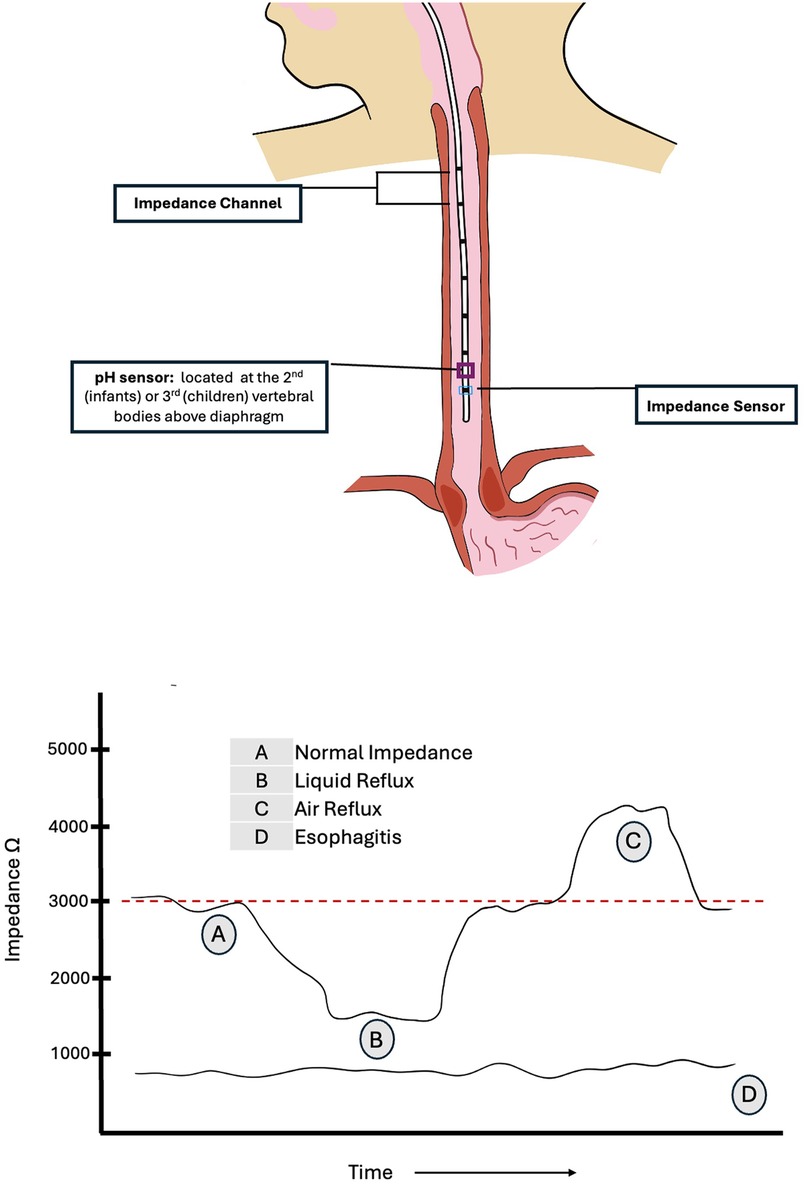 Baseline impedance generally ranges from 2,000 to 4,000 ohms (8). However, a study in asymptomatic preterm infants demonstrated that basal impedance is lower in very young infants, with a median value of 1,750 ohms [IQR: 1,500–2,050] (14). By convention, during the MII-pH study, a successive drop in impedance by more than 50% from baseline observed in at least two distal electrodes in retrograde direction from the stomach is recorded as a liquid reflux event. It is important to note that certain pathological conditions such as esophagitis or motility disorders may be associated with lower baseline impedance in the esophagus, which can make it more difficult to detect a 50% further drop in impedance. Consequently, this may result in lower rates of reflux detection when using MII-pH in these conditions (6, 15, 16). Baseline impedance values below 900 ohms have been shown to have a 100% positive predictive value for severe esophagitis in children (17). Additionally, lower esophageal baseline impedance levels have been observed in other GER-associated comorbidities such as bronchopulmonary dysplasia of prematurity (18). Impedance testing can also differentiate between air, which produces a rise in impedance, typically above 3,000 ohms, and liquid which produces a drop in impedance. These changes are often represented in color-coded plot.