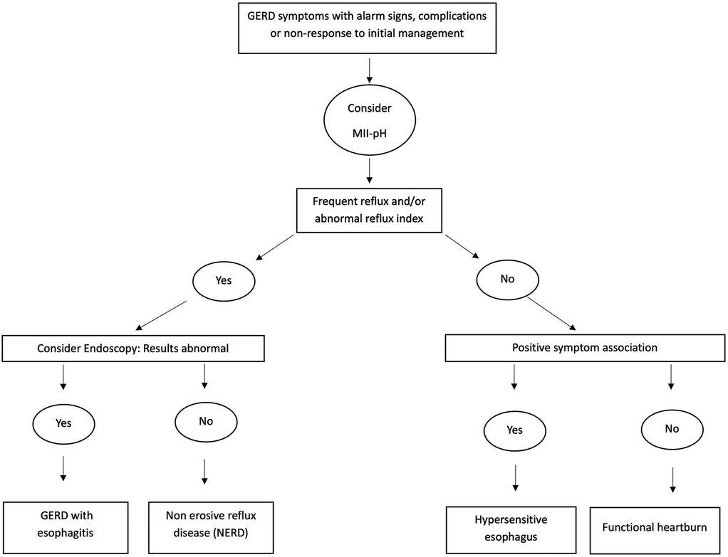 The use of symptomatology alone to diagnose and treat GERD is likely to lead to overdiagnosis and over treatment in young children. The American Academy of Pediatrics (AAP) advises against the routine use of anti-reflux medication for GER symptoms alone (3). Utilizing accessible, safe, and cost-effective means for diagnosing GERD, particularly in high-risk infants and young children, would facilitate the delivery of targeted therapy when clinically indicated. In 2018, the North American Society for Pediatric Gastroenterology, Hepatology, and Nutrition (NASPGHAN) and the European Society for Pediatric Gastroenterology, Hepatology, and Nutrition (ESPGHAN) issued updated guidelines on GERD management. Although there is no universal gold standard for GERD diagnosis in infants and young children, a step wise approach with screening for alarm symptoms, then dietary modifications, followed by a brief trial of acid suppression and referral to gastroenterology specialists as a “third line” for testing was recommended. Despite its advantages, it was concluded that there is currently insufficient evidence to support the use of combined multichannel intraluminal impedance and pH testing (MII-pH) as a standalone diagnostic tool for the diagnosis of GERD in infants and children (1). The working group suggested considering the use of MII-pH to correlate (a) persistent troublesome symptoms with acid and alkaline reflux events, (b) clarify the role of acid and alkaline reflux in the etiology of esophagitis, (c) determine the efficacy of acid suppression therapy, and (d) differentiate non-erosive reflux disease, hypersensitive esophagus and functional heartburn in patient with normal endoscopy (1). This review aims to summarize findings from existing literature involving cohorts of young children with and without GER symptoms, who have undergone MII-pH studies. Additionally, we also report expert consensus guidelines on the use of MII-pH for GER evaluation in this population, including how to interpret and apply the MII-pH results in different GER phenotypes. This review also addresses the clinical relevance of novel MII-pH indices and their potential application. Lastly, we highlight the current limitations in applying the results of MII-pH in young children, emphasizing the gaps in the literature and the need for further studies to demonstrate improved clinical outcomes with the use of MII-pH in this demographic.