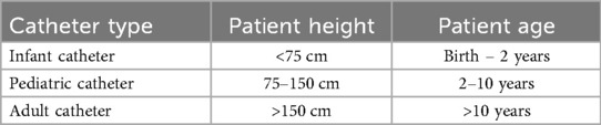 Impedance, defined as voltage divided by current, is inversely proportional to the ionic concentration of a medium. It is measured in ohms. The use of impedance measurements to study GER was first described in 1991 (4), followed by guidance on pediatric application (5–8). The technique involves the use of an appropriately sized nasogastric catheter, typically equipped with six or seven impedance sensing electrodes or rings along its length. There are usually 6 impedance channels, one channel being the segment between two adjacent electrodes. As esophageal contents move along the length of the catheter, the impedance electrodes sense the change in electrical impedance, thereby determining the nature (gas vs. liquid) and location (upper vs. lower esophagus) of the refluxate. Additionally, one distal electrode also carries a pH sensor made of antimony, ion-sensitive field-effect transistor (ISFET), or glass. Catheters may also incorporate a feeding tube or a simplified manometric device. The diameter of the probe is typically 2.13 mm (6.4 Fr) and both single use and multiuse catheters are available, with either internal (preferred) or external (skin) reference electrodes. Ambulatory device set ups are also available. Catheter size selection is based on the patient's height or age, as outlined in Table 1 (7, 8).