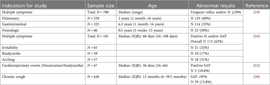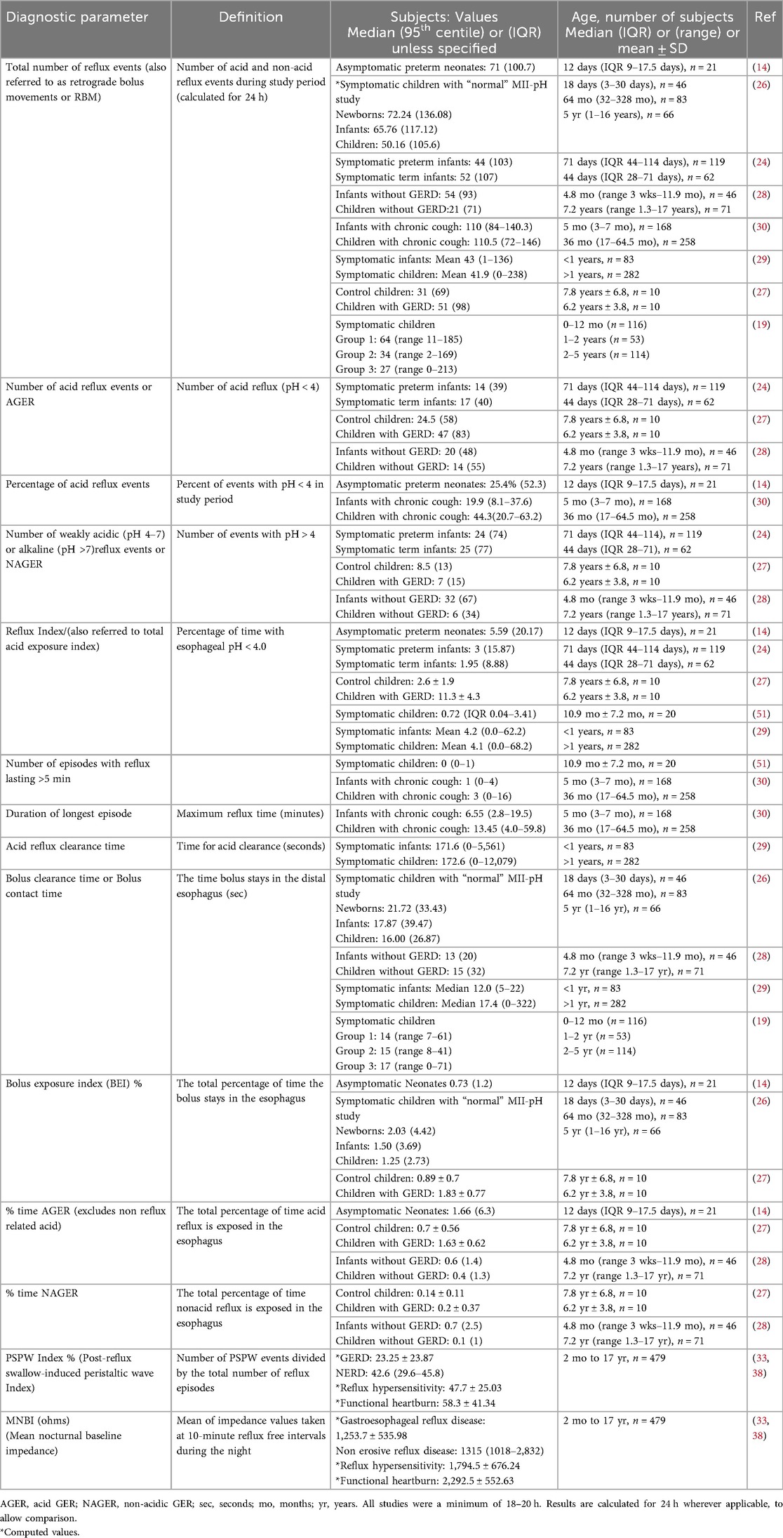 The reflux index (RI) and the number of reflux episodes (also known as retrograde bolus movements or RBM) per 24 h are the most frequently used parameters. The number of GER episodes can be reported as the total number of GER episodes, and the number and percentage of AGER and NAGER episodes. RI is defined as the percentage of time with esophageal pH < 4.0 in 24 h. RI often includes reflux and non-reflux related acid exposure. The threshold for abnormal RI in infants (<1 year) and children (>1 year) was recently recommended to be >10% and >5% respectively by some experts (1, 19), while in the past, others have recommended >12% and >6%, respectively (22). Previously, in 2009, both NASPGHAN and ESPGHAN had recommended that an RI threshold of <3%, 3%–7% and >7% be used as normal, indeterminate and abnormal, respectively (23). When compared to term infants and older healthy children, the RI was shown to be higher in both symptomatic and asymptomatic preterm infants (95th centile 15%–20% vs. ≤10% respectively) (14, 24, 25). The range of RI reported in children is wide, as shown in Table 2. Severe cohorts of children with GER symptoms are seen to have low/normal RI, which would suggest that measurement of esophageal acid exposure alone is not adequate to understand the pathogenesis of GER symptoms. It is also possible that in some patients, these purported GER symptoms may not be related to reflux at all.