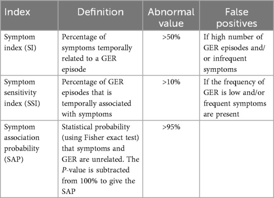 While the reflux parameters described above are used to characterize the nature of reflux in terms of frequency, duration and pH, another important diagnostic consideration is the association of GER events with symptoms. The temporal association of symptoms with GER episodes can be determined with MII-pH testing by time marking the occurrence of symptoms during the study. Several authors have reported symptoms occurring both before and after reflux events, hence establishing association rather than causation. Variation exists in the time interval used to define positive association between symptom occurrence and GER episodes. Reported acceptable intervals range from 30 to 120 s (6, 19, 20) and may be as long as up to five minutes (24, 34–36). Additionally, some studies also suggest using different time intervals for different GER symptoms (6, 37). The three symptom indices - symptom index (SI), symptom sensitivity index (SSI) and symptom association probability (SAP) are then calculated as shown in Table 3. The symptom indices are measures of probability of the association of symptoms and GER episodes and are therefore influenced by the frequency of symptoms and GER events. Several authors have reported temporal symptom association data in cohorts of young children using MII-pH. Table 4 summarizes some of these recent studies. Symptoms studied include both gastrointestinal and non-gastrointestinal symptoms. As shown, variable proportions of symptomatic children in each cohort had positive symptom association, defined as SI > 50%, SSI > 10% and/or SAP > 95%.